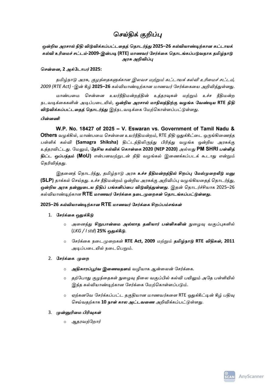 நீண்ட நாட்களாக நிலுவையில் இருந்த RTE நிதி விவகாரத்தில், சென்னை உயர்நீதிமன்றம் மாநில அரசுக்குச் சாதகமாக உத்தரவு பிறப்பித்துள்ளது. இதன் தொடர்ச்சியாகவும், உச்ச நீதிமன்ற நடவடிக்கைகளின் காரணமாகவும் மத்திய அரசு நிலுவையில் உள்ள நிதியை விடுவிப்பதற்கான செயல்முறைகளை மேற்கொண்டு வருகிறது. இது தமிழ்நாட்டில் உள்ள தனியார் பள்ளிகளில் 25% ஒதுக்கீட்டில் பயிலும் மாணவர்களின் கல்விக் கட்டண நிலுவைச் சிக்கலுக்குத் தீர்வு காண உதவும்.